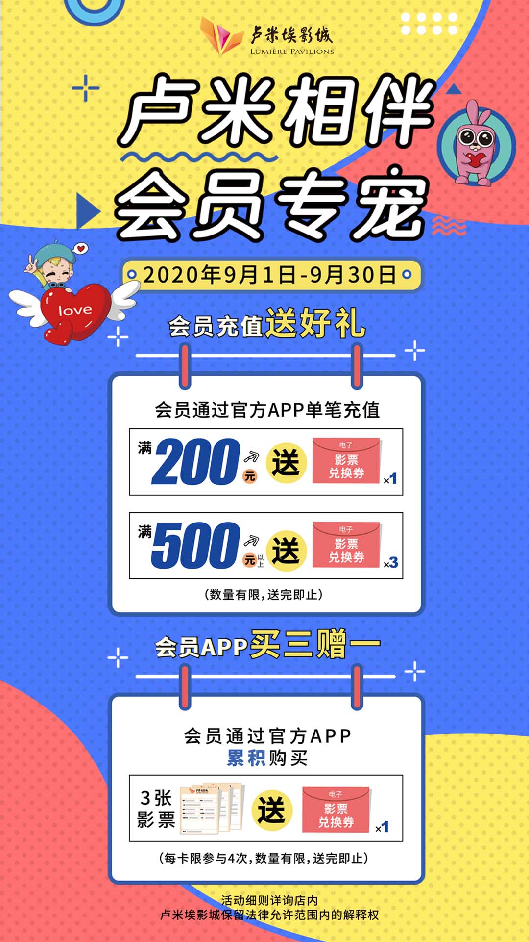 活动期间,会员通过官方APP充值满200元送影票兑换券1张,充500元及以上送影票兑换券3张,数量有限,送完即止!
